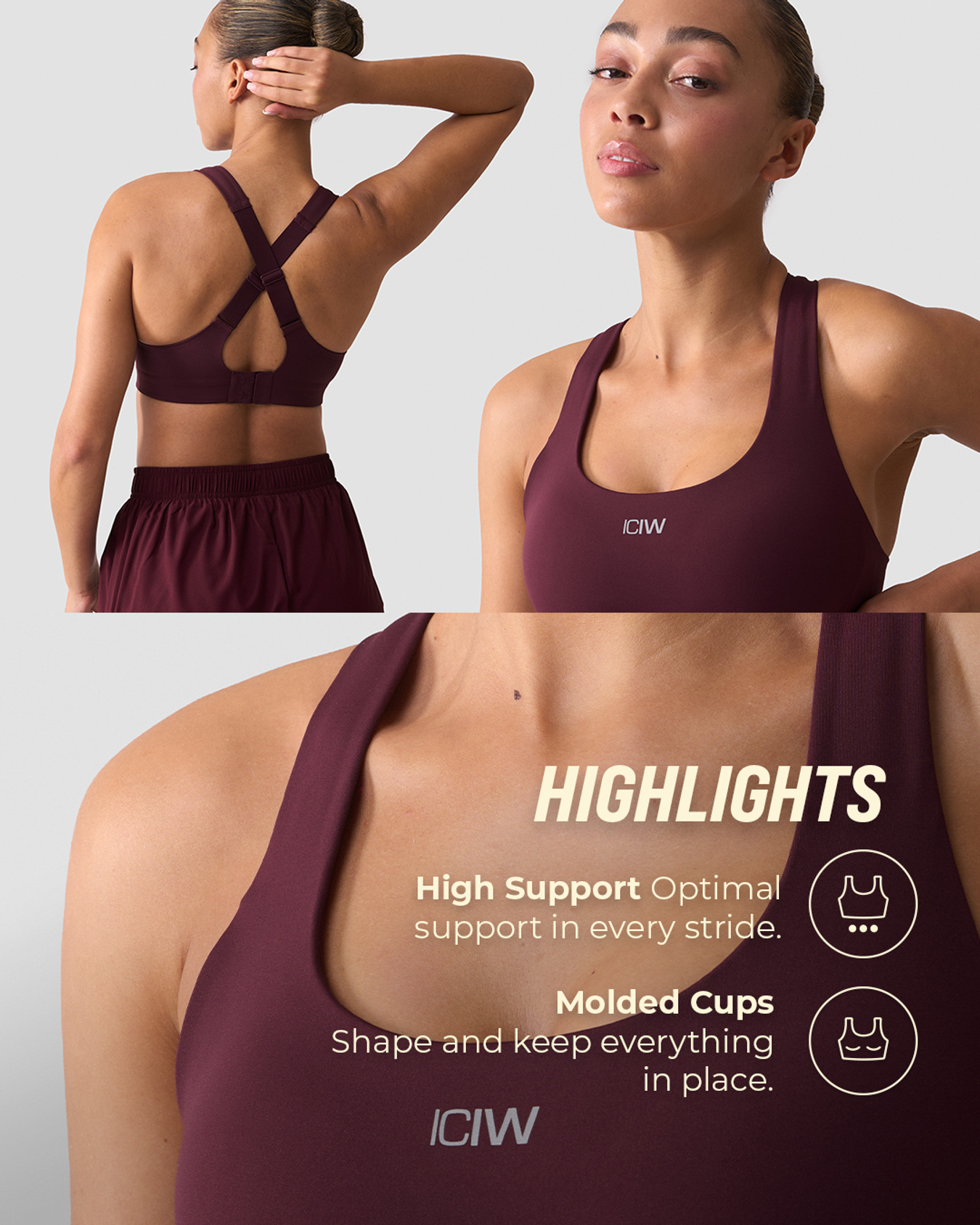 Sports-bh med högt stöd för högintensiv konditionsträning. Det fuktavledande interlock-tyget håller dig sval och torr, medan den slimmade cut-and-sew-konstruktionen ger en stabil, omslutande känsla. Formpressade kupor ger form och stöd, och justerbara axelband med dubbla justerare samt hak- och hyskknäppning gör att du kan anpassa passformen. Avslutad med ett ICIW-tryck för en ren och stilren look. 75% Polyamid, 25% Elastan.